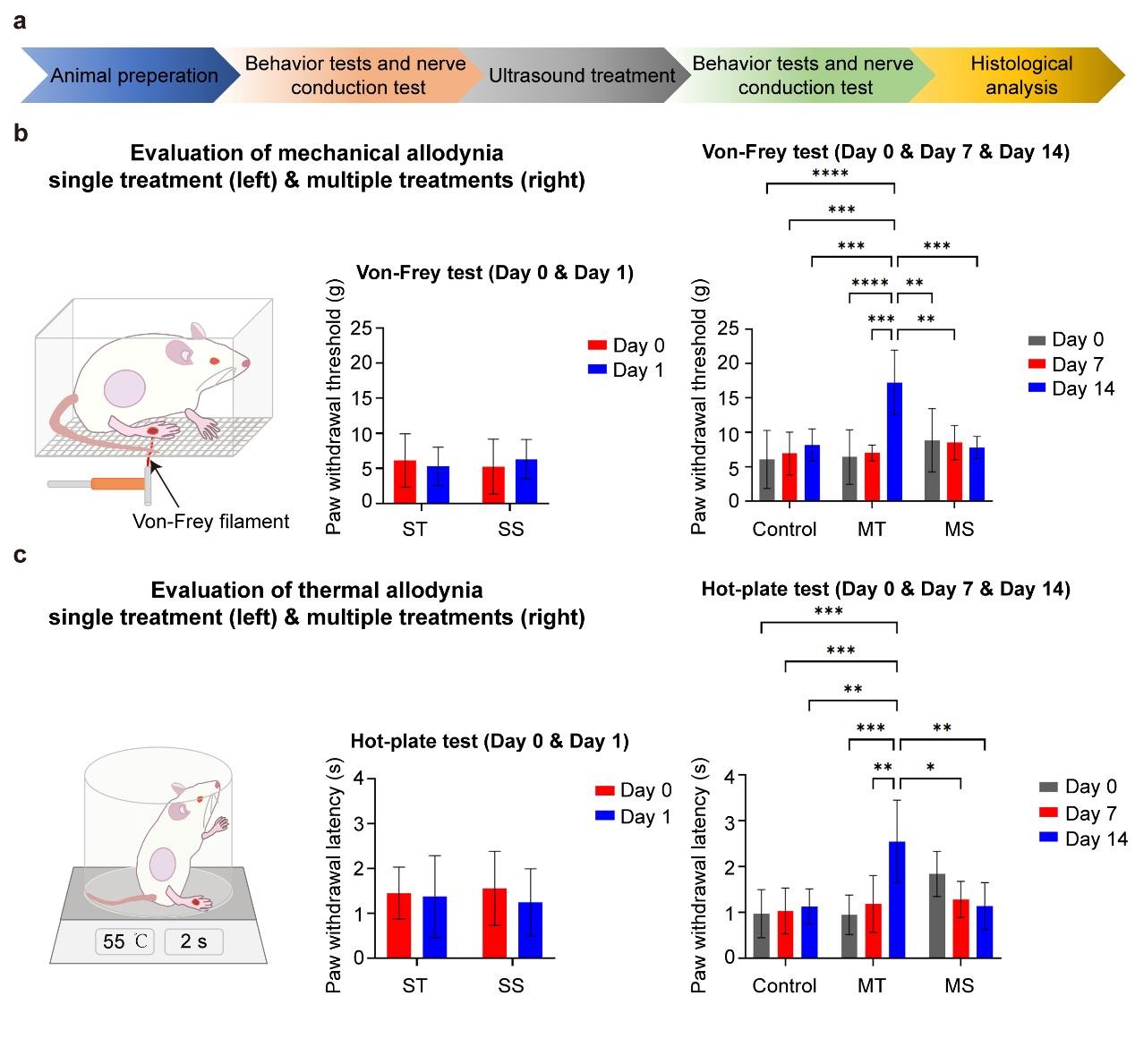 在曲率半径为9.17 cm的曲面测试中,该超声贴片展现出优异的性能指标:自然聚焦深度达10.5 mm,声压0.45 MPa,声强Ispta277 mW/cm2, 声强Isppa357 mW/cm2,焦点处能够升温6.2 ℃。在糖尿病足大鼠模型中开展的疗效验证显示,相较于阴性对照,经过两周超声治疗的大鼠,其机械性痛觉阈值和热痛觉阈值都得到了显著的提升,且生物安全性实验表明设备对神经组织和细胞无不良影响。