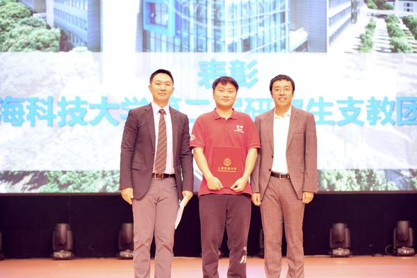在典礼的特别环节,印杰副校长和团委书记寇煦丰共同为第二届研究生支教团成员狄海川同学颁奖。狄海川在支教工作期间,用实际行动践行了“立志、成才、报国、裕民”的育人精神,学校授予其所在支教团“特殊贡献奖”,并授予他个人“优秀志愿者”荣誉称号。