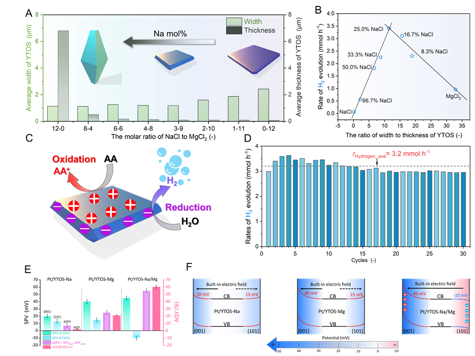 1 A-D: YTOS十面体薄片晶面暴露比例调控及晶面导向下的光催化产氢活性优化;E-F: 表面光电压显微镜解析晶面间内建电场分布